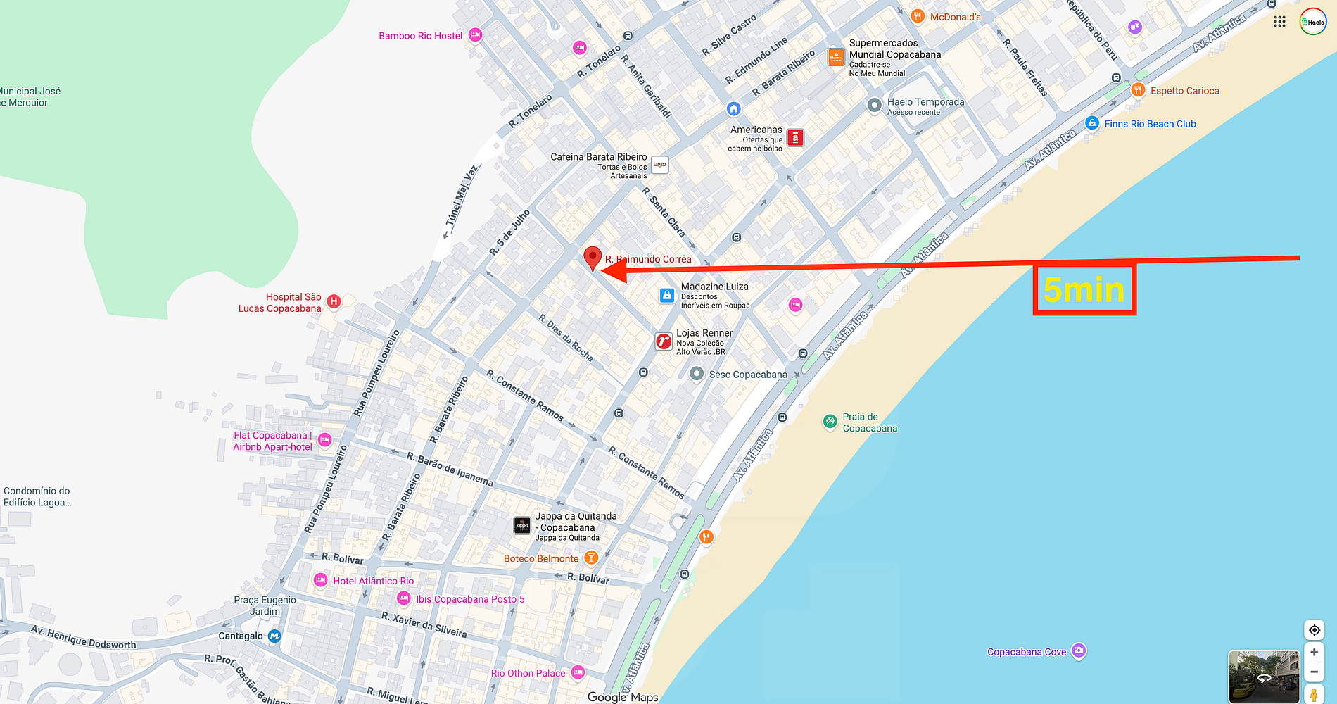 O apartamento fica perto do metrô Siqueira Campos e de várias linhas de ônibus. Não há estacionamento no prédio, mas há garagens e vagas pagas próximas. O Aeroporto Santos Dumont fica a cerca de 20–25 minutos, o Galeão a 35–45 minutos e a rodoviária Novo Rio a aproximadamente 25–30 minutos.