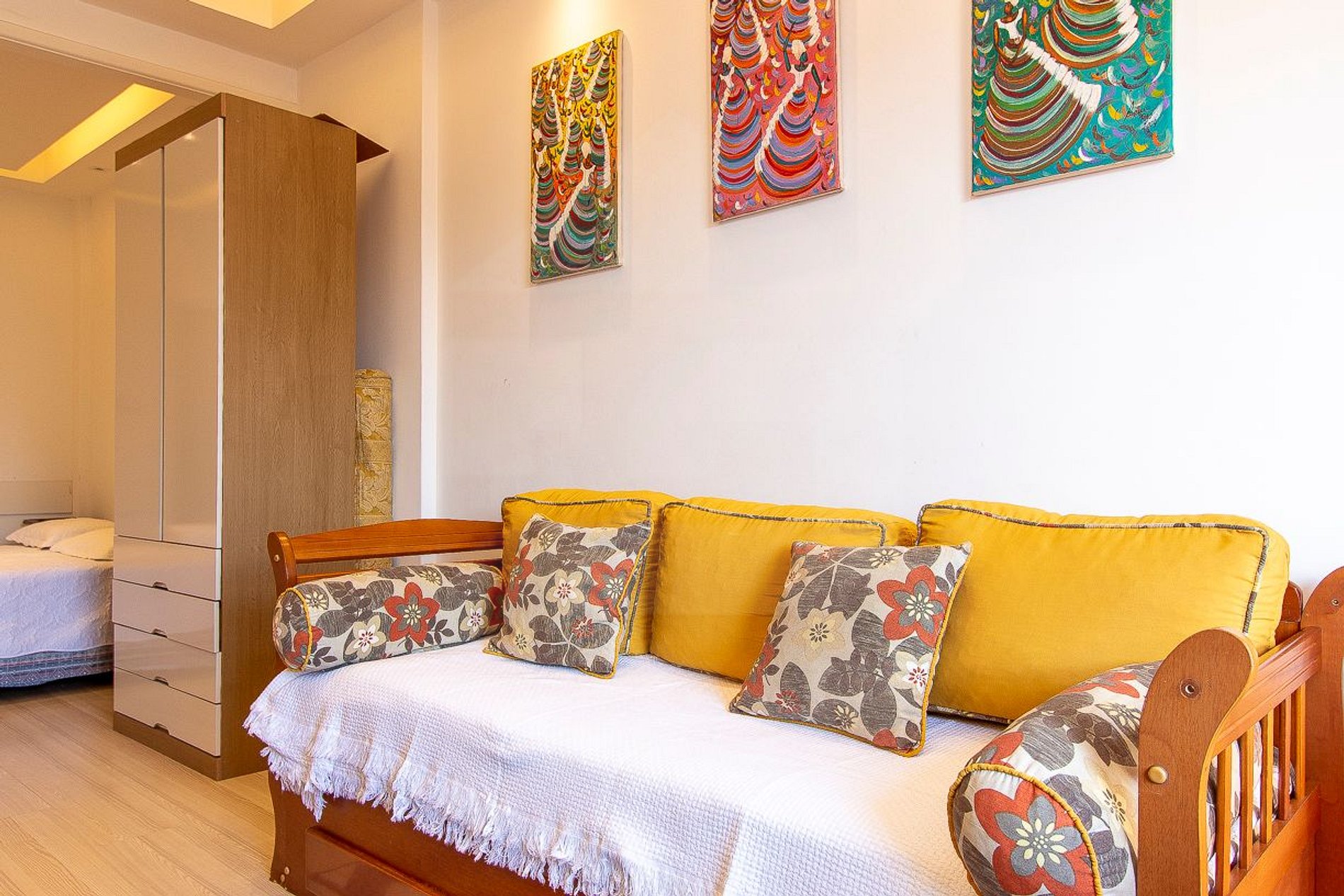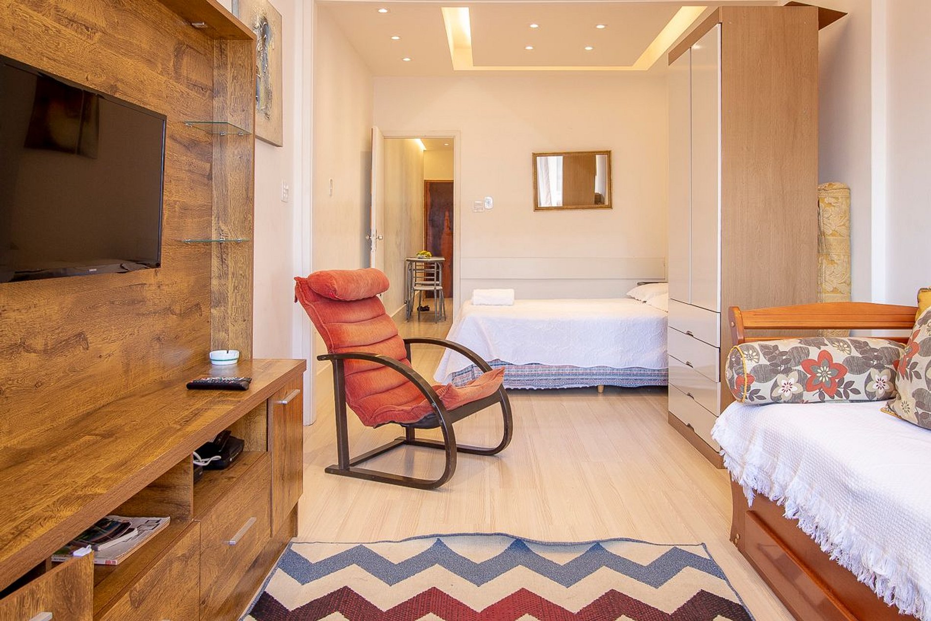 Sala bem decorada dividida em dois ambientes com cama de casal, sofá bicama, TV 32, mesa, cadeiras, ventilador de teto e outros itens.