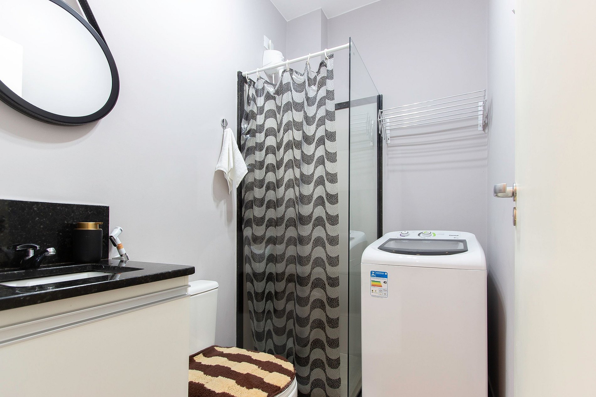Banheiro: Completo com chuveiro elétrico e maquina de lavar roupa.