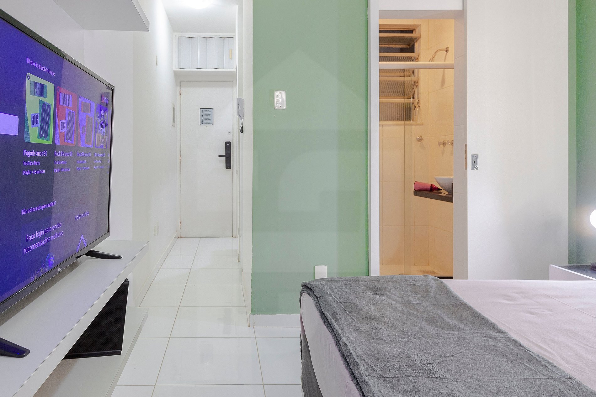 O banheiro possui chuveiro aquecido a gás e box em blindex, garantindo seu conforto. Além disso, há também um ferro de passar roupa disponível.