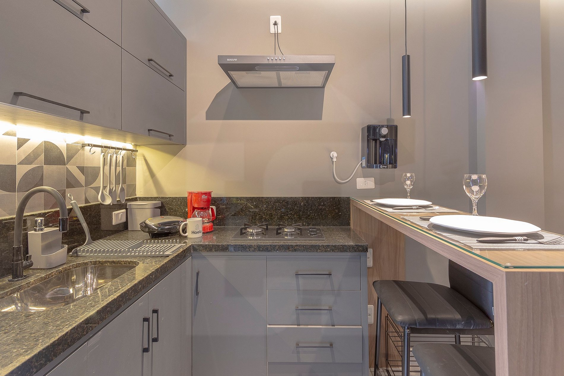 Cozinha equipada com utensílios, fogão, geladeira, cafeteira e mais.