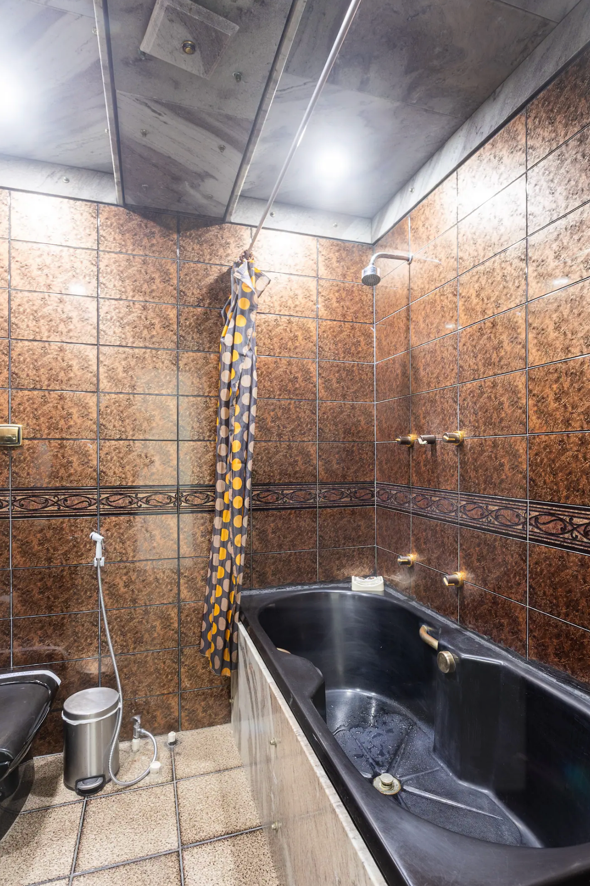 Full bathroom with bathtub and shower. Building with elevator and 24-hour doorman. Conveniently located near shops, restaurants, malls, subway, bike rentals, and taxis.