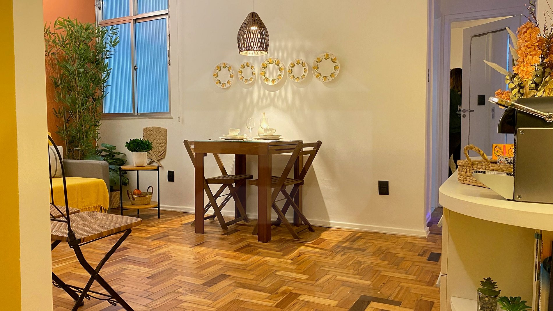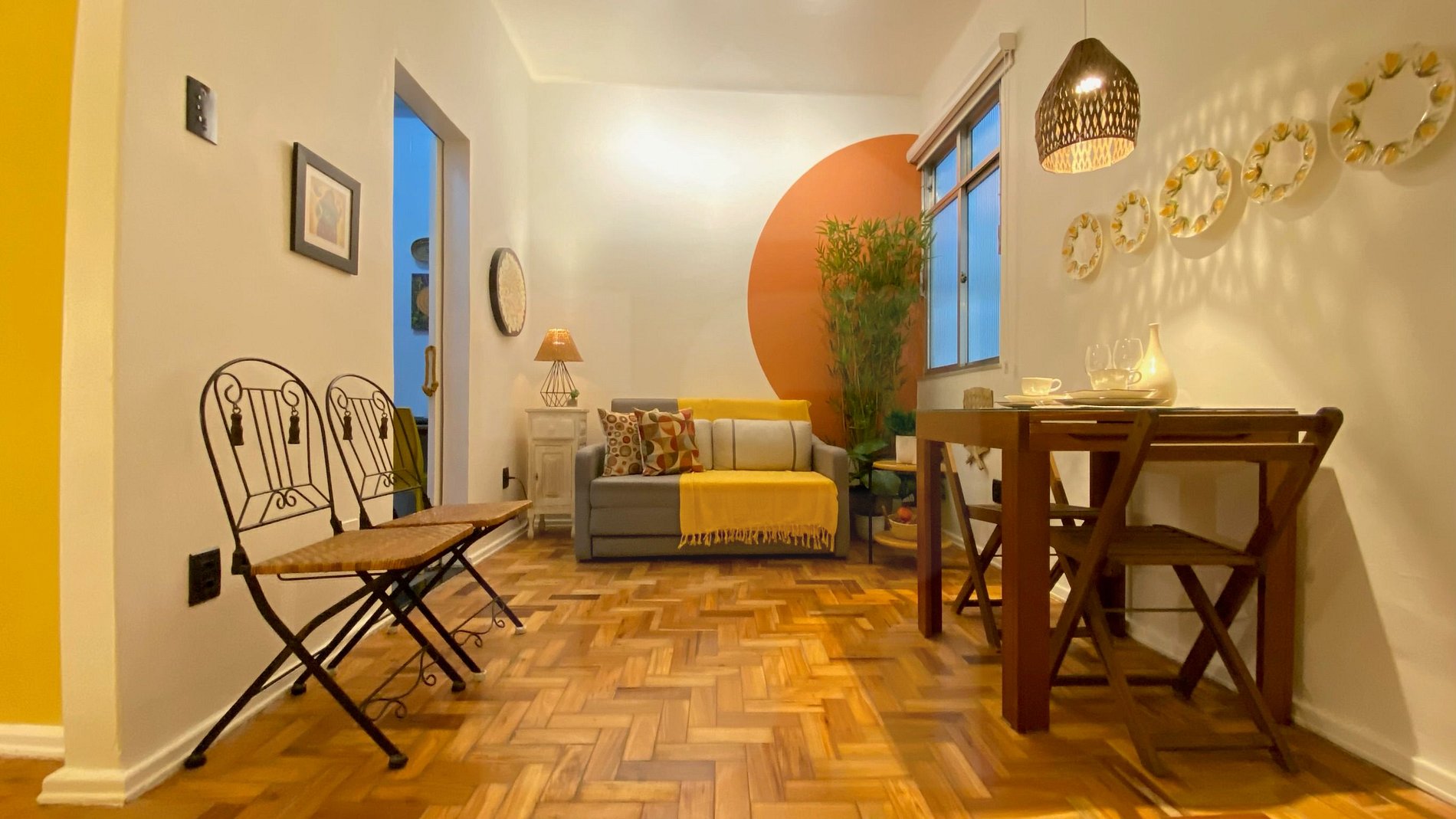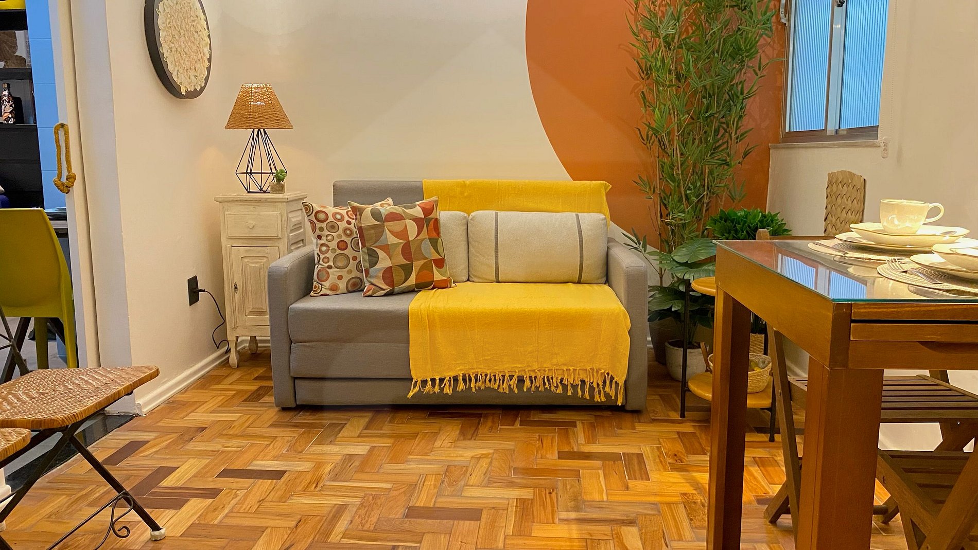 Quiet and cozy apartment, at the back of the building, just 100 m from Copacabana Beach and 500 m from Ipanema Beach. Located in a residential building with 24-hour concierge and security. Perfect for couples and families of up to 4 people, with 1 bedroom with a double bed and a sofa bed in the living room. Features a home office, Smart TV, Wi-Fi, fully equipped kitchen, and cheerful decor with colors and details that add charm and comfort.