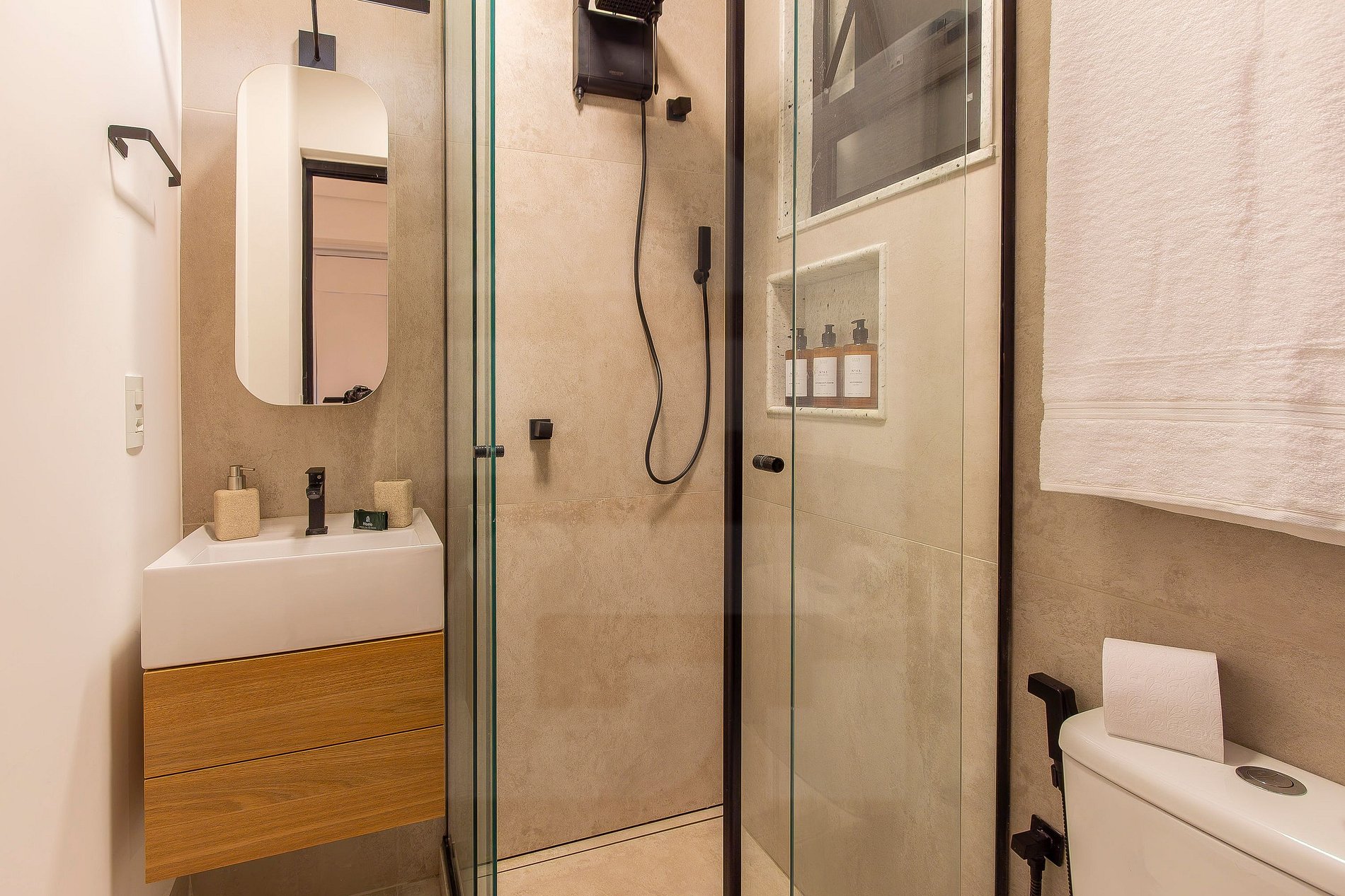 The studio is well divided to ensure comfort and functionality in every area: Bedroom: Queen size bed and air conditioning for a restful sleep. Home Office: Located next to the bed, ideal for work. Living Room: Two-seater sofa and Smart TV for relaxation. Dining Area: Table for two. Kitchen: Fully equipped with stove, microwave, oven/air fryer, fridge, and washer-dryer. Bathroom: Modern, with a Blindex glass shower.