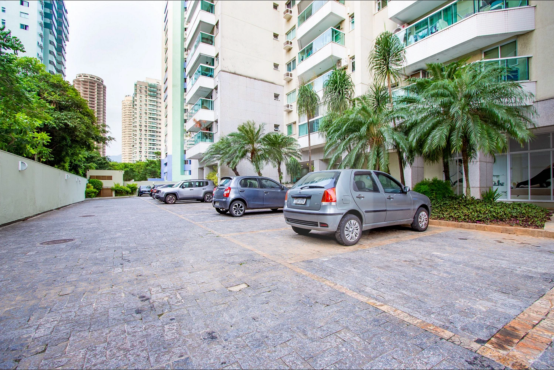 O apartamento está localizado em uma rua que conecta a Avenida das Américas à praia, próximo ao shopping Downtown.