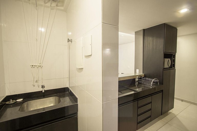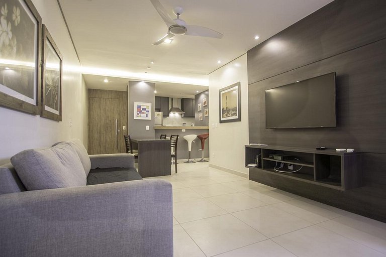 The living room has double sofa bed, flat screen TV with cable channels, wifi, panel, ceiling fans and decorative works, being integrated with the American kitchen completely equipped with hood, refrigerator, stove, microwave, water filter and all the household items necessary for you to feel at home!