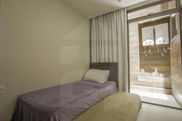 The second suite has a double bed, split air conditioning, a planned closet and a blackout curtain for your total comfort, as well as access to a charming outdoor area with showers.