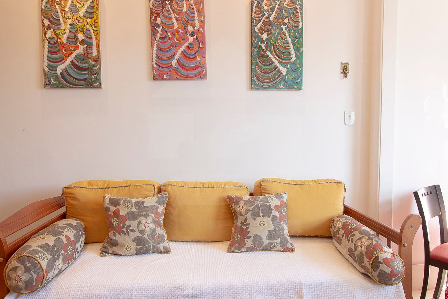 Sala bem decorada dividida em dois ambientes com cama de casal, sofá bicama, TV 32, mesa, cadeiras, ventilador de teto e outros itens.