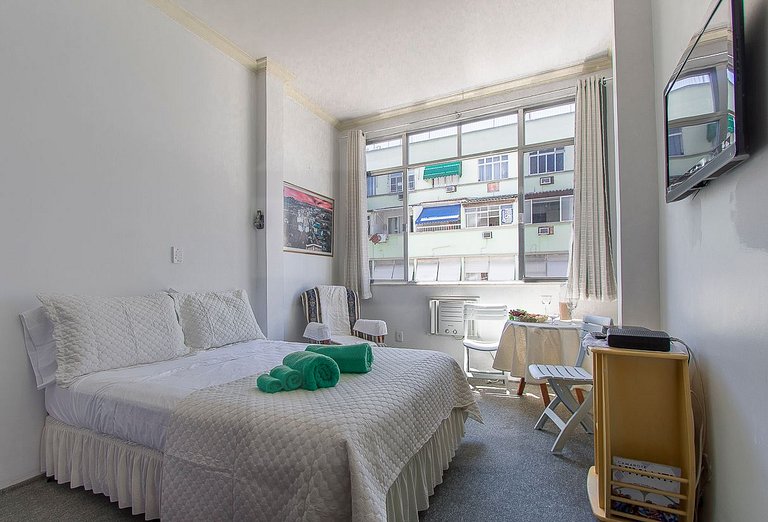 Localizado ao lado do hotel Hilton, com vista para o mar e próximo ao polo gastronômico de Copacabana. Fácil acesso aos principais pontos turísticos do Rio de Janeiro, ideal para até 2 pessoas. Perfeito para passeios ao ar livre, ciclismo, banho de mar e outras atividades cariocas. Quarto com cama de casal, ar condicionado, ventilador, TV a cabo e colchão de solteiro disponível. Cozinha equipada com utensílios completos. Banheiro com aquecedor. Internet wi-fi grátis. Faça sua consulta!